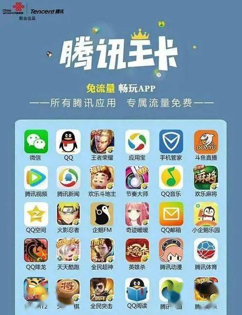 二、近 200款应用流量全免:腾讯旗下所有应用( QQ、微信、腾讯视频、QQ音乐、王者荣耀、和平精英、QQ浏览器、微视、腾讯地图....),全国免流量,国内流量 1元=1G。